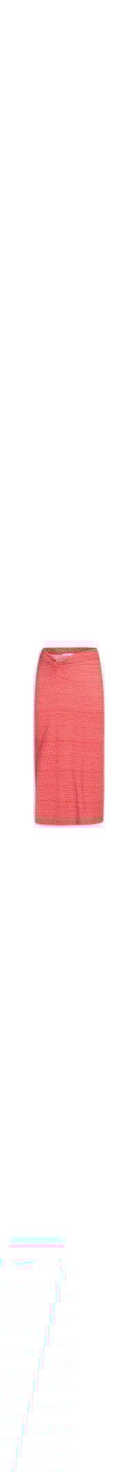 A saia vermelha é confeccionada em malha leve de média elasticidade. A peça justa ao corpo, possui cintura alta, detalhe de nó frontal, cós com elástico embutido na parte posterior, fenda lateral, tag metalizada da marca aplicada na parte posterior da cintura, estampa abstrata em cores contrastantes e comprimento midi.