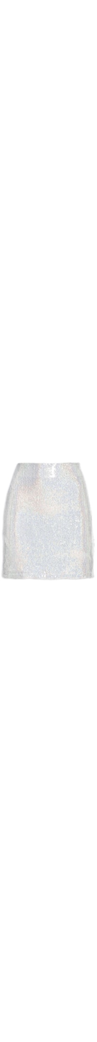 A saia prata é confeccionada em malha com superfície em paetês. A peça solta ao corpo possui cintura alta, forro, comprimento curto e fechamento posterior por zíper invisível.