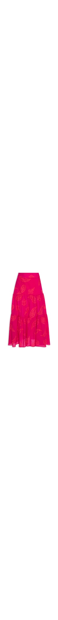 A saia rosa é confeccionada em tecido leve sem elasticidade. A peça solta ao corpo possui cintura alta, meio forro, tag da marca aplicada em metal na parte posterior na altura do cós, recortes com detalhe de franzido, meio forro, padronagem pailey em bordado com cor contrastante, bolsos frontais embutidos, comprimento midi e fechamento posterior por zíper.