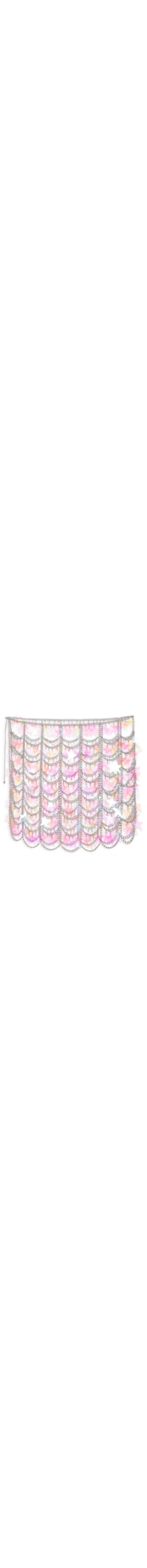 A saia roxa é produzida em metal. A peça solta ao corpo possui cintura alta, corrente entrelaçada com padrão quadriculado, aplicação figurativa de estrelas em acetato metalizado, comprimento curto e fechamento lateral em corrente alongada com fecho lagosta para ajuste.