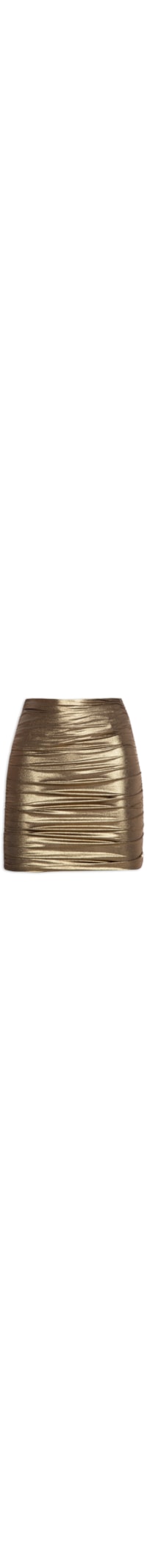 A saia dourada é confeccionada em malha leve com superfície metalizada de média elasticidade. A peça justa ao corpo, possui cintura alta, franzido as laterais, tag metalizada da marca aplicada na parte frontal da barra e comprimento curto.