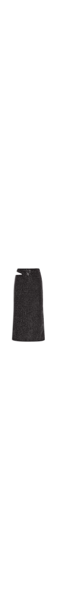 A saia preta é confeccionada em malha com superfície hotfix. A peça possui cintura alta, recorte vazado e detalhe franzido na região frontal, tag aplicada na região posterior, fenda na região mposterior, comprimento midi e shape solto.