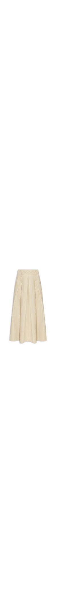 A saia bege é confeccionada em sarja sem elasticidade. A peça de modelo evasê solta ao corpo possui cintura alta, cós com passantes, pregas frontais e posteriores, bolsos frontais embutidos, comprimento midi e fechamento posterior por zíper.