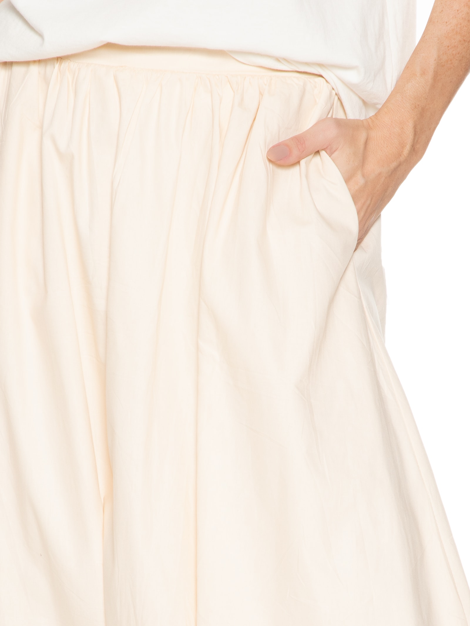 A saia bege é confeccionada em tecido leve sem elasticidade. A peça solta ao corpo possui cintura alta, cós com elástico embutido na parte posterior, forro, bolsos frontais embutidos, elástico embutido na barra e comprimento midi.