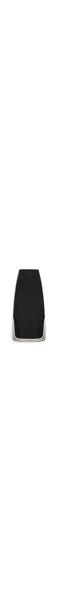 A saia preta é confeccionada em tecido leve sem elasticidade. A peça solta ao corpo, possui cintura alta, fendas laterais, pences posteriores, barra arredondada com tiras de gorgurão aplicadas em cor contrastante, comprimento midi, forro e fechamento posterior pro zíper invisível.