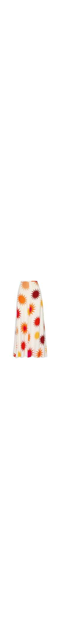 A saia bege é confeccionada em tecido leve com toque de linho e sem elasticidade. A peça solta ao corpo possui cintura média, estampa figurativa de sol em cores contrastantes, leve transparência, forro curto, comprimento midi e fechamento posterior por zíper invisível.