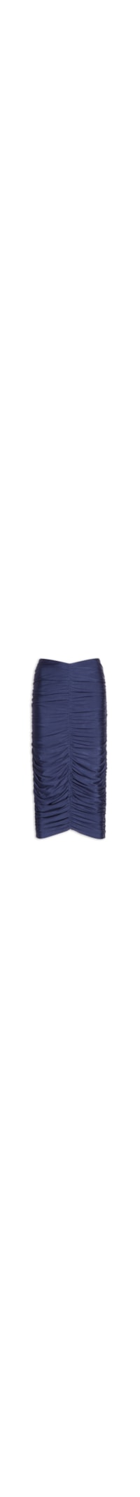 A saia azul marinho é confeccionada em tecido leve com baixa elasticidade. A peça justa ao corpo possui cintura alta, recorte posterior e frontal, drapeado nas partes posterior e frontal, elástico embutido no cós e comprimento midi.