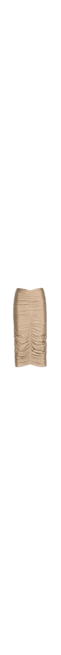 A saia bege é confeccionada em tecido leve com baixa elasticidade. A peça justa ao corpo possui cintura alta, recorte posterior e frontal, drapeado nas partes posterior e frontal, elástico embutido no cós e comprimento midi.