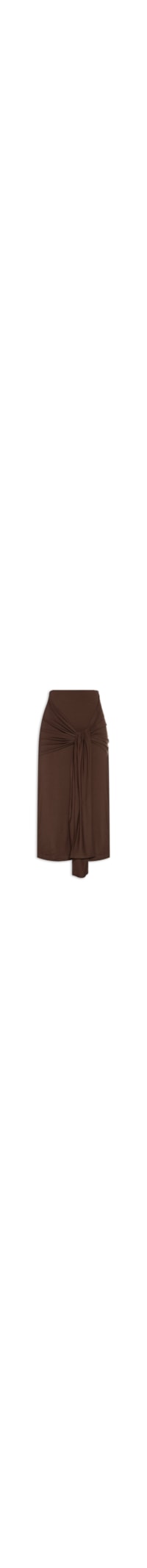A saia marrom é confeccionada em tecido leve com alta elasticidade. A peça solta ao corpo possui cintura alta, cós com elástico embutido, faixas laterais sobrepostas para amarração, forro e comprimento midi.