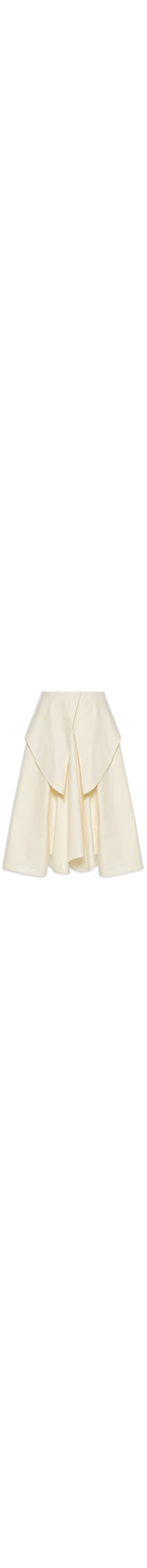 A saia bege é confeccionada em tecido leve sem elasticidade. A peça solta ao corpo, possui cintura alta, recortes assimétricos sobrepostos na parte frontal, recortes frontais e posteriores, barra ondulada na parte frontal, comprimento midi e fechamento posterior por zíper invisível.