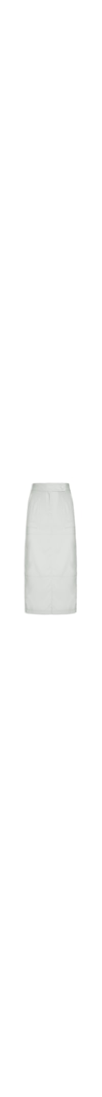 A saia cinza é confeccionada em tecido leve. A peça possui cintura alta, pences posteriores na altura do cós, bolsos frontais, fenda posterior, recortes posteriores e frontais, comprimento midi, shape solto, caimento reto, acabamento pespontado e fechamento frontal por botões e zíper.
