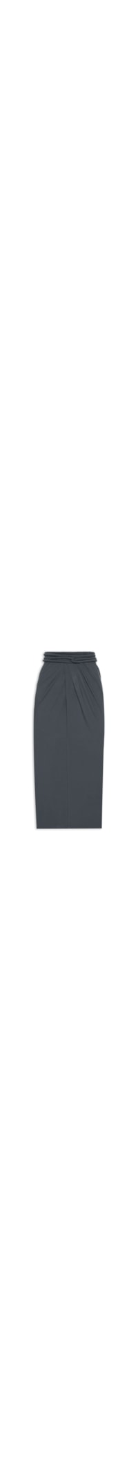A saia cinza é confeccionada em malha leve com alta elasticidade. A peça justa ao corpo possui cós com cordão aplicado para amarrações, cintura alta, franzidos frontais, fenda posterior, abertura frontal próxima ao cós, recorte frontal e comprimento midi.