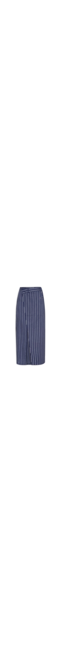 A saia azul marinho é confeccionada em tecido leve com toque de linho com baixa elasticidade. A peça solta ao corpo possui cintura alta, cós com passantes aplicados, bolso frontal decorativo, recorte frontal sobreposto, recortes frontais e posteriores, padronagem de listras em cor contrastante branco, comprimento midi e fechamento posterior por zíper.