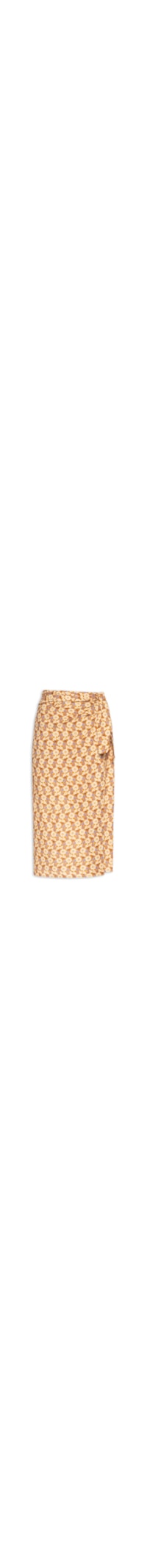 A saia bege é confeccionado em tecido levecom toque de linho sem elasticidade. A peça solta ao corpo possui cintura alta, cós amplo, tecido sobreposto a parte frontal com detalhe de amarração e efeito drapeado, padronagem abstrata em cores contrastantes e comprimento midi.