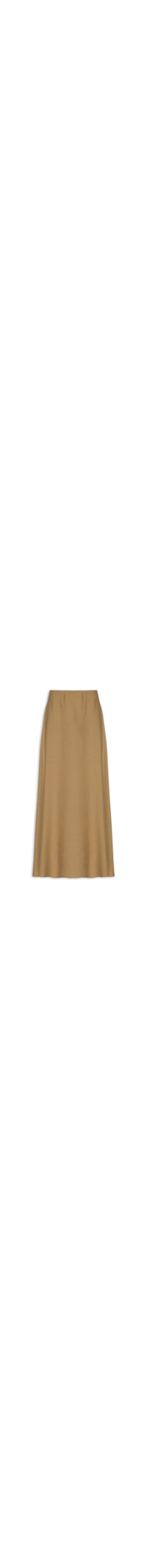 A saia marrom é confeccionada em tecido leve com toque linho sem elasticidade. A peça possui cós alto, caimento evasê ao longo do quadril e comprimento, recorte central posterior, comprimento midi e fechamento posterior por zíper invisível.