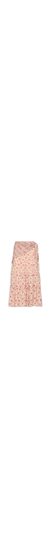 A saia rosa é confeccionada em tecido leve sem elasticidade. A peça solta ao corpo possui cintura alta, cós com elástico, recortes frontais e posteriores, mix de estampa floral em cores contrastantes, meio forro e comprimento midi. Acompanha faixa em mesmo tecido e estampa para amarração opcional.