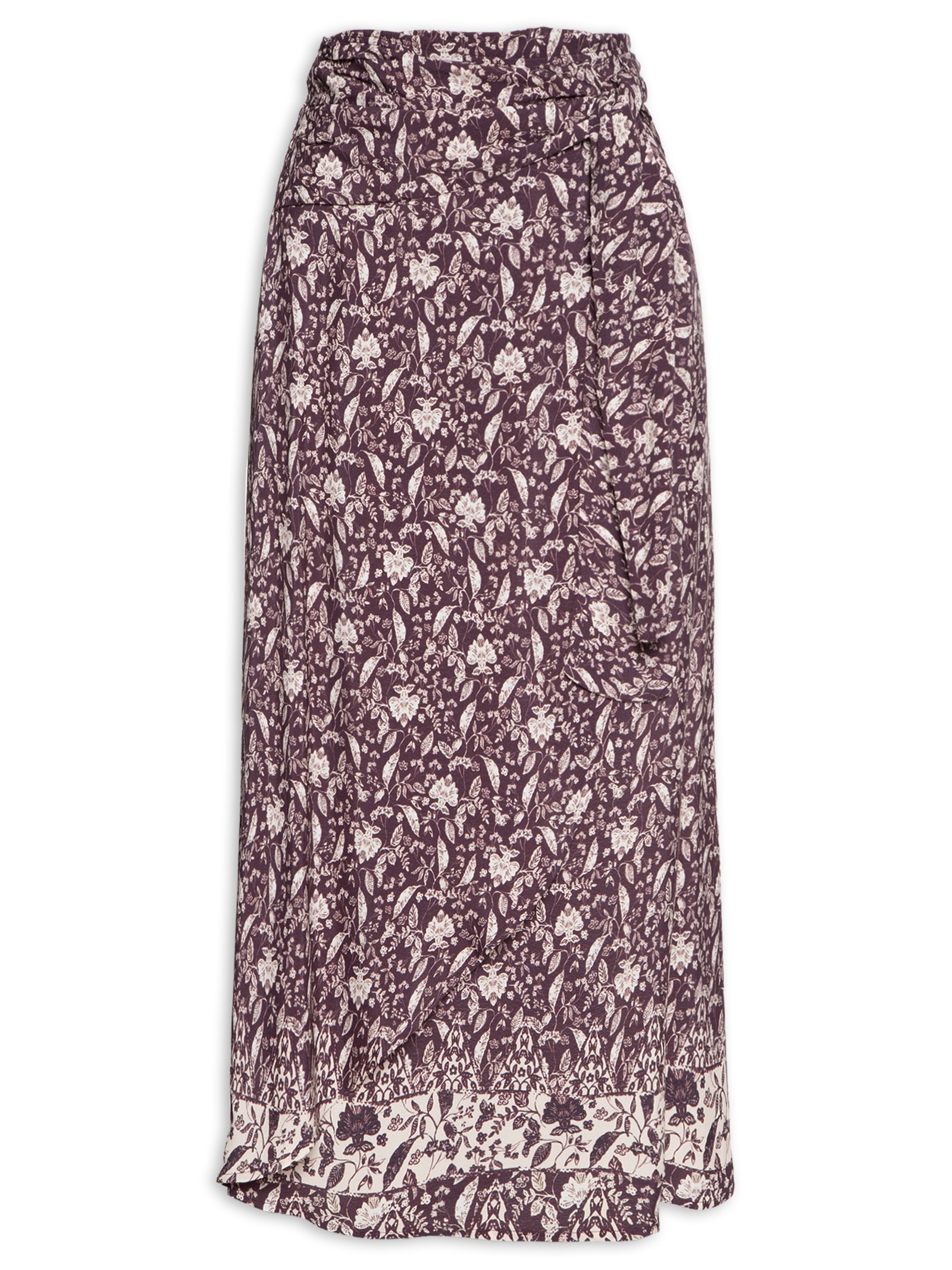 A saia roxa é confeccionada em tecido leve sem elasticidade. A peça solta ao corpo possui cintura alta, recorte superior sobreposto com efeito drapeado e tiras alongadas para amarração frontal, recorte frontal assimétrico sobreposto no comprimento, mix de estampas em cor contrastante, comprimento midi e fechamento lateral por zíper invisível.