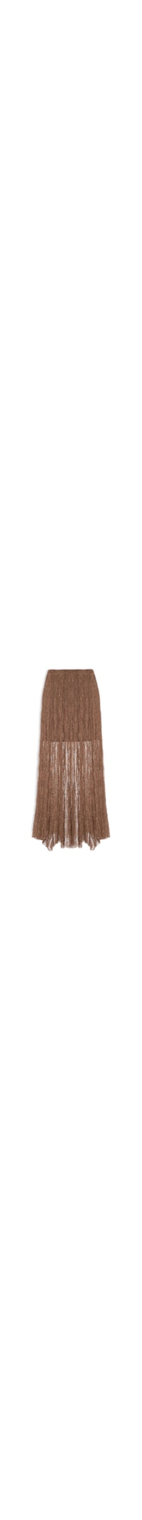 A saia marrom é confeccionada em renda. A peça solta ao corpo possui cintura alta, cós com elástico embutido, meio forro e comprimento midi.