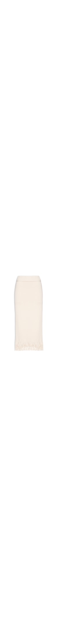 A saia off white é confeccionada em tricot com alta elasticidade. A peça justa ao corpo possui cintura alta, cós elástico com acabamento canelado, franjas aplicadas na barra e comprimento midi.