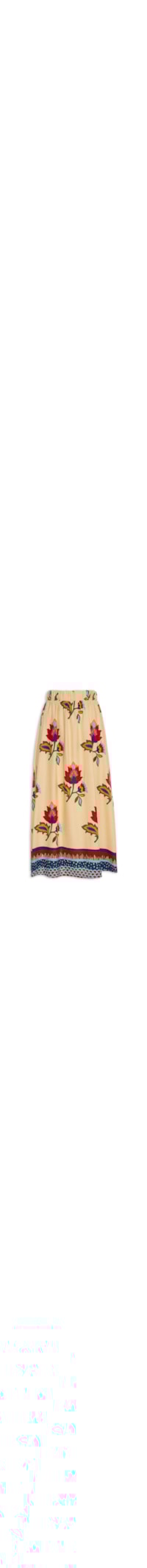 A saia bege é confeccionada em tecido leve com toque de linho. A peça possui cintura alta, cós com elástico embutido, mix de estampas em cores contrastantes, comprimento midi e shape solto.