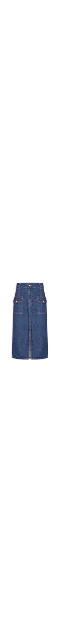 A saia azul é confeccionada em sarja com lavagem jeans sem elasticidade. A peça solta ao corpo possui cintura alta, cós com passantes aplicados, dois bolsos frontais com aba sobreposta e com fechamento por botão de swarovski, bolsos posteriores, fenda frontal, comprimento midi e fechamento frontal por zíper e botão.