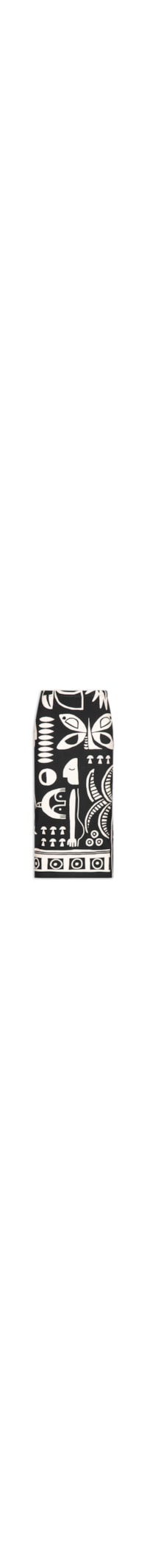 A saia preta é confeccionada em malha canelada com alta elasticidade. A peça solta ao corpo possui cintura alta, cós com elástico embutido, recortes laterais em gorgurão com listra na cor off white, estampas figurativas em cores contrastante e comprimento midi.
