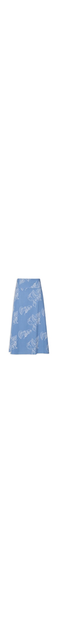 A saia azul é confeccionada em tecido leve com toque de linho e sem elasticidade. A peça solta ao corpo possui cintura alta, cós amplo, bolsos frontais embutidos, bordados figurativos de folhagem em cor contrastante, comprimento midi e fechamento posterior por zíper invisível.