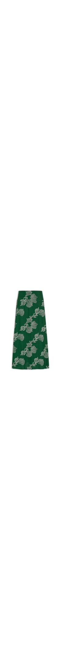 A saia verde é confeccionada em tecido leve com toque de linho sem elasticidade. A peça solta ao corpo, possui cintura alta, cós largo, bolsos frontais embutidos, fendas laterais, bordados figurativos em cor contrastante, comprimento midi e fechamento posterior por zíper invisível.