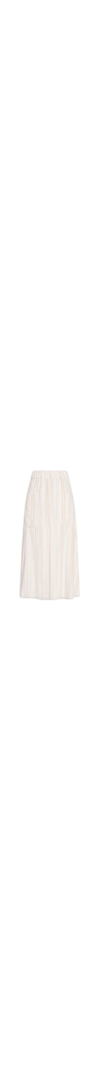 A saia bege é confeccionada em tecido leve com toque de linho sem elasticidade. A peça solta ao corpo possui cintura alta, cós com elástico embutido, bolsos frontais, fenda frontal, padronagem listrada em tom contrastante e comprimento midi.