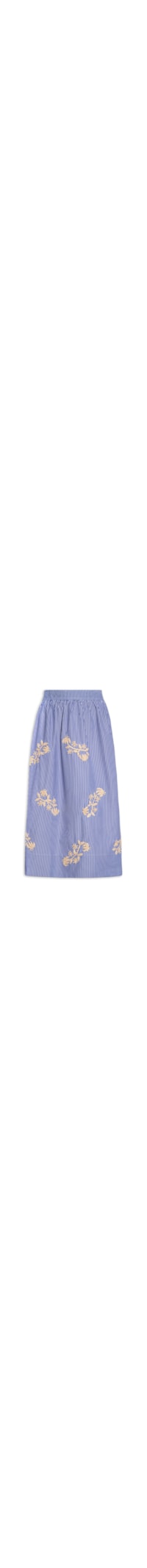 A saia azul é confeccionada em tecido leve sem elasticidade. A peça solta ao corpo possui cós com elástico embutido, cintura alta, aplicação de bordado figurativo floral na cor bege, bolsos frontais embutidos, padronagem de listras na cor branca e comprimento midi.