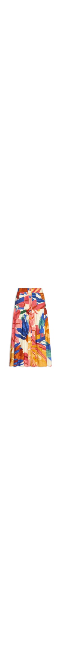 A saia azul é confeccionada em linho misto sem elasticidade. A peça solta ao corpo, possui cintura alta, bolsos frontais, recortes frontais, recorte na altura do quadril com leve franzido, estampa floral em cores contrastantes, comprimento midi e fechamento frontal por botões forrados.