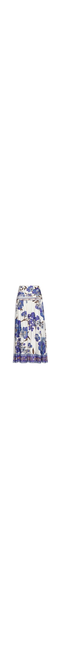 A saia azul é confeccionada em tecido leve sem elasticidade. A peça solta ao corpo possui cintura alta, recorte posterior em lastex, recorte frontal com detalhe de drapeado, mix de estampas em cores contrastantes e comprimento midi.