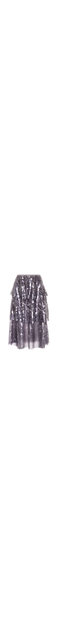 A saia prata é confeccionada em tule com superfície em paetês. A peça possui cintura alta, babado aplicado em camadas, comprimento midi, caimento reto, acabamento pespontado e e fechamento lateral por zíper invisível.