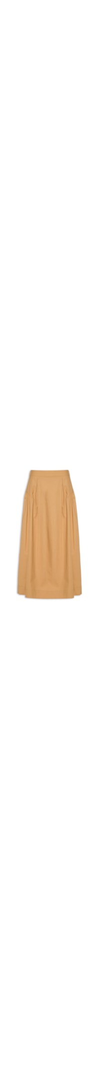 A saia bege é confeccionada em tecido leve sem elasticidade. A peça solta ao corpo possui cintura alta, cós com elástico aplicado na parte posterior, pregas na parte frontal, recorte lateral franzido, comprimento midi, forro e fechamento lateral com zíper invisível.