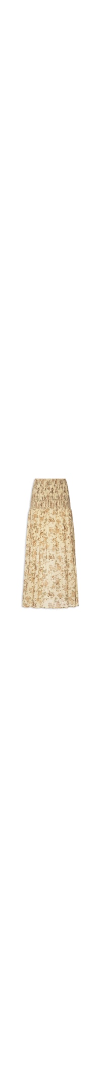 A saia bege é confeccionada em tecido leve com aplicação de fios de lurex sem elasticidade. A peça solta ao corpo possui cintura alta, pala com recorte e aplicação de lastex, leve franzido, estampa floral em cores contrastantes, comprimento midi e forro.