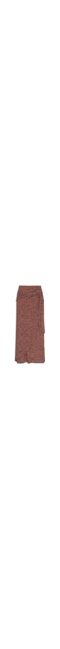 A saia marrom é confeccionada em tecido leve sem elasticidade. A peça solta ao corpo possui cós aplicado com detalhe transpassado, padronagem geométrica em estampa contínua, sobreposição frontal com amarração lateral formando efeito envelope , comprimento midi e barra levemente arredondada, sem forro e fechamento por amarração lateral.