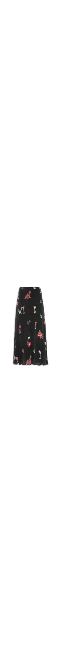 A saia preta é confeccionada em tecido leve com superfície plissada com alta elasticidade. A peça solta ao corpo possui cintura alta, cós com elástico embutido, mix de estampas em cores contrastantes e comprimento midi.