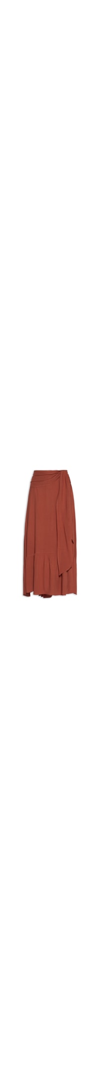 A saia marrom é confeccionada em tecido leve com superfície texturizada sem elasticidade. A peça solta ao corpo possui cintura alta, cós com recorte drapeado sobreposto e faixa estendidas para amarração, recorte com detalhes de pregas, comprimento midi e fechamento posterior por zíper invisível.