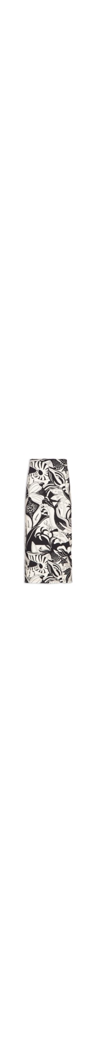 A saia preta é confeccionada com tecido leve com alta elasticidade. A peça justa ao corpo possui cintura alta, acabamento canelado, caimento reto, estampa figurativa em cor contrastante e comprimento midi.