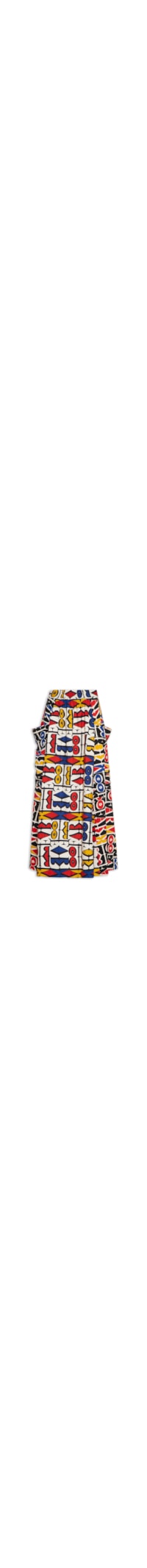 A saia bege é confeccionada em linho misto sem elasticidade. A peça solta ao corpo possui cintura alta, cós com recorte posterior e frontal em lastex, recortes e bolsos laterais, estampa abstrata em cores contrastantes e comprimento midi.