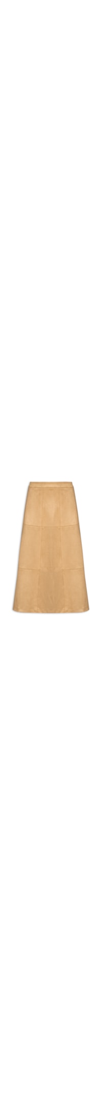 A saia bege é confeccionado em suede com efeito camurça. A peça solta ao corpo, possui cintura alta, caimento levemente evasê, comprimento midi, recortes ao longo do comprimento com pesponto aparente, fechamento é posterior por zíper.