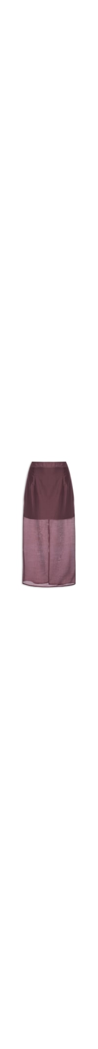 A saia vinho é confeccionada em tecido leve sem elasticidade. A peça solta ao corpo possui cintura alta, pences posteriores e frontais, recorte posterior com fenda, meio forro, comprimento midi, transparência e fechamento posterior por zíper invisível.