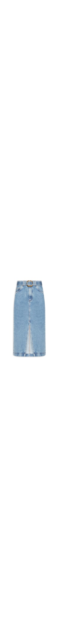 A saia azul é confeccionada por sarja com lavagem jeans sem elasticidade. A peça solta ao corpo possui cintura alta, passantes aplicados no cós, five pockets*, tag da marca metalizada aplicada no bolso posterior, recorte posterior, fenda frontal, comprimento midi e fechamento frontal por botões e zíper. Acompanha cinto em tira média com fivela metálica para ajuste e uso opcional.