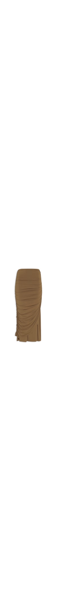 A saia marrom é confeccionada em malha de poliamida com alta elasticidade. A peça justa ao corpo possui cintura alta, cós elástico, detalhe de sobreposição na parte frontal e posterior, detalhe de franzidos nas laterais com efeito drapeado e comprimento midi.
