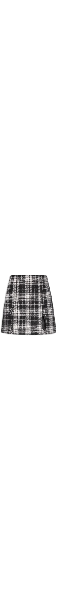 A saia preta é confeccionada em tweed com fios de lurex e sem elasticidade. A peça solta ao corpo possui cintura alta, fendas frontais, forro, comprimento mini, padronagem xadrez na cor branca e fechamento posterior em zíper invisível.