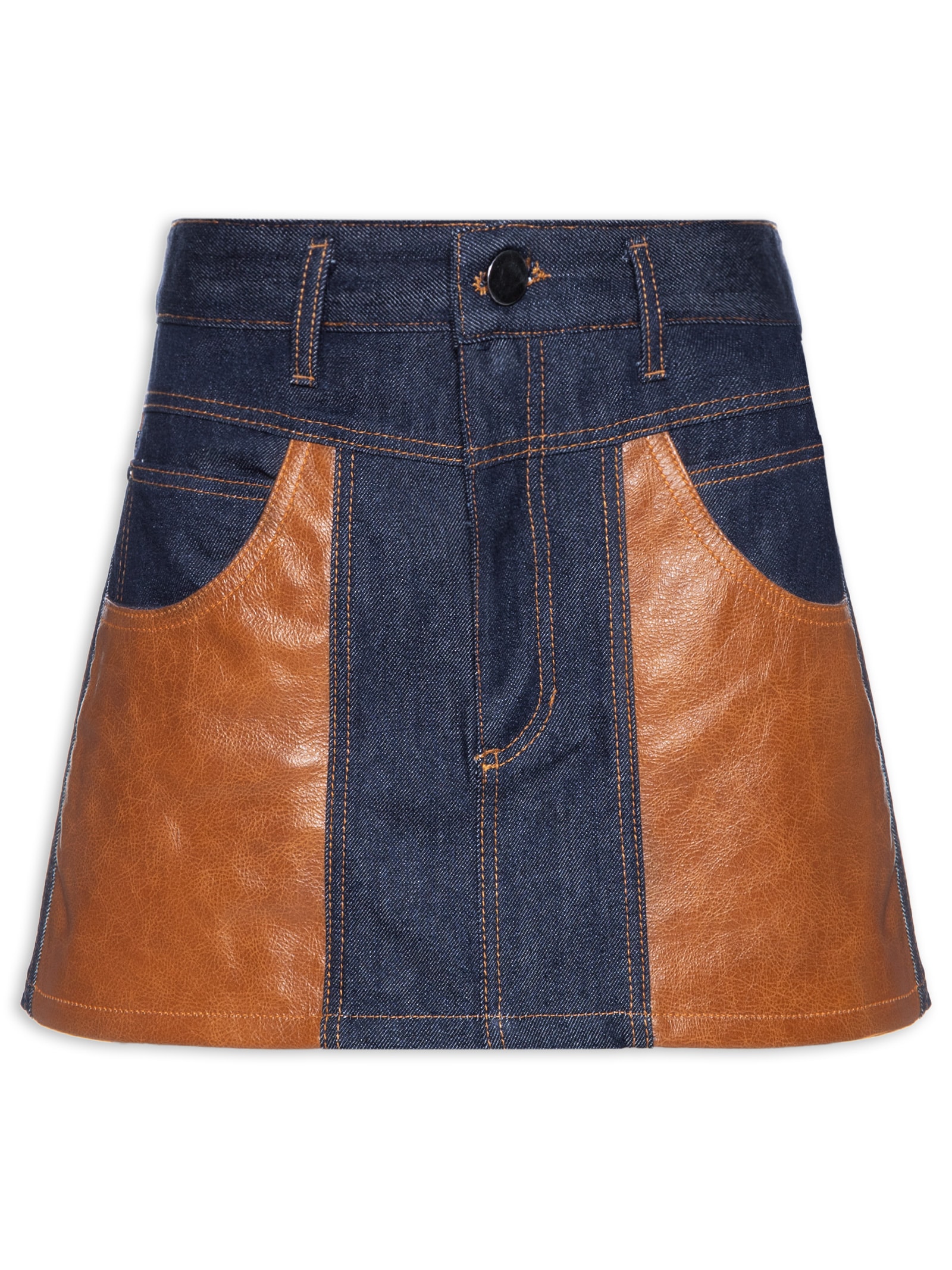 A saia azul marinho é confeccionada em sarja com lavagem em jeans sem elasticidade. A peça solta ao corpo possui cintura alta, cós com passantes, recorte posterior e frontal em couro marrom, five pockets*, comprimento curto e fechamento frontal por botão e zíper.