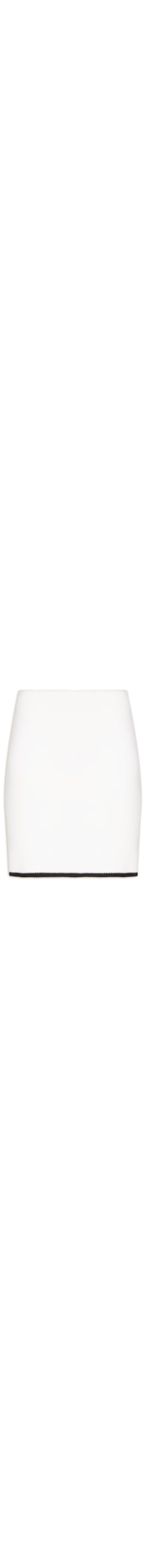 A saia branca é confeccionada em tricot com superfície texturizada e de baixa elasticidade. A peça solta ao corpo possui cintura alta, barra com friso na cor preta e comprimento curto.
