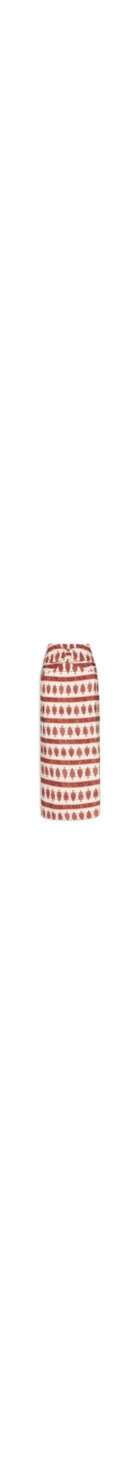 A saia vermelha é confeccionada em tecido leve com toque de linho sem elasticidade. A peça solta ao corpo possui cintura alta, recorte superior sobreposto com efeito franzido nas laterais e argola embutida na parte frontal, fendas laterais, mix de estampas em cores contrastantes, comprimento midi e fechamento lateral em zíper invisível.