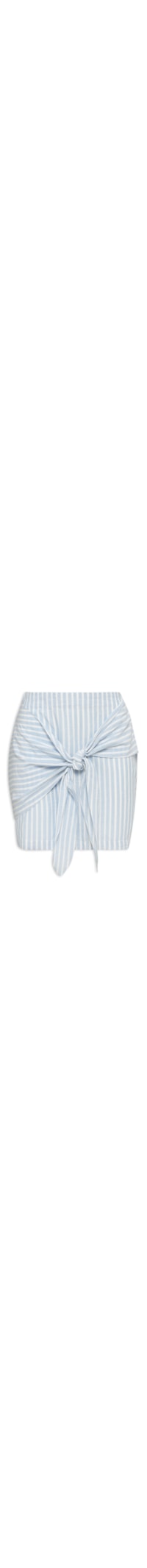 A saia azul é confeccionada em tecido leve. A peça solta ao corpo possui cintura alta, recorte frontal assimétrico alongado para amarração, pences posteriores, padronagem listrada em cor contrastante, comprimento curo e fechamento posterior por zíper invisível.