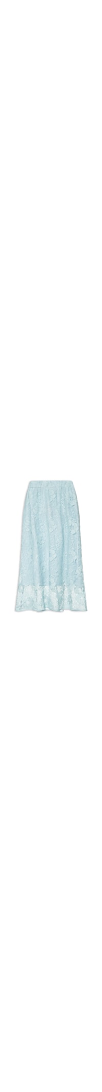 A saia azul é confeccionada em renda sem elasticidade. A peça solta ao corpo, possui cintura alta, cós com elástico embutido, bolsos frontais embutidos, tag metalizada da marca aplicada na parte posterior, transparência inferior, padronagem floral, comprimento midi, forro e fechamento posterior por zíper invisível.
